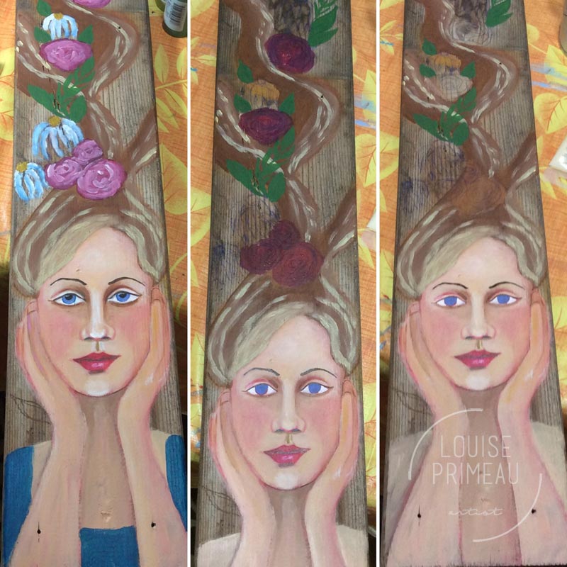 After staring at her for all those months, I added more colour to the flowers and decided I wanted to collage some words about flowers on the cedar plank.