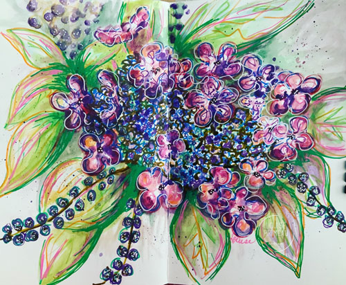 I have been working on florals over many months – all of them abstract, impressionistic much like my pet portraits, as I am not a photorealistic painter. My sketchbooks are places where I experiment quite a bit so I am including a few photos below, from my Epsilon sketchbook devoted to floral spreads.